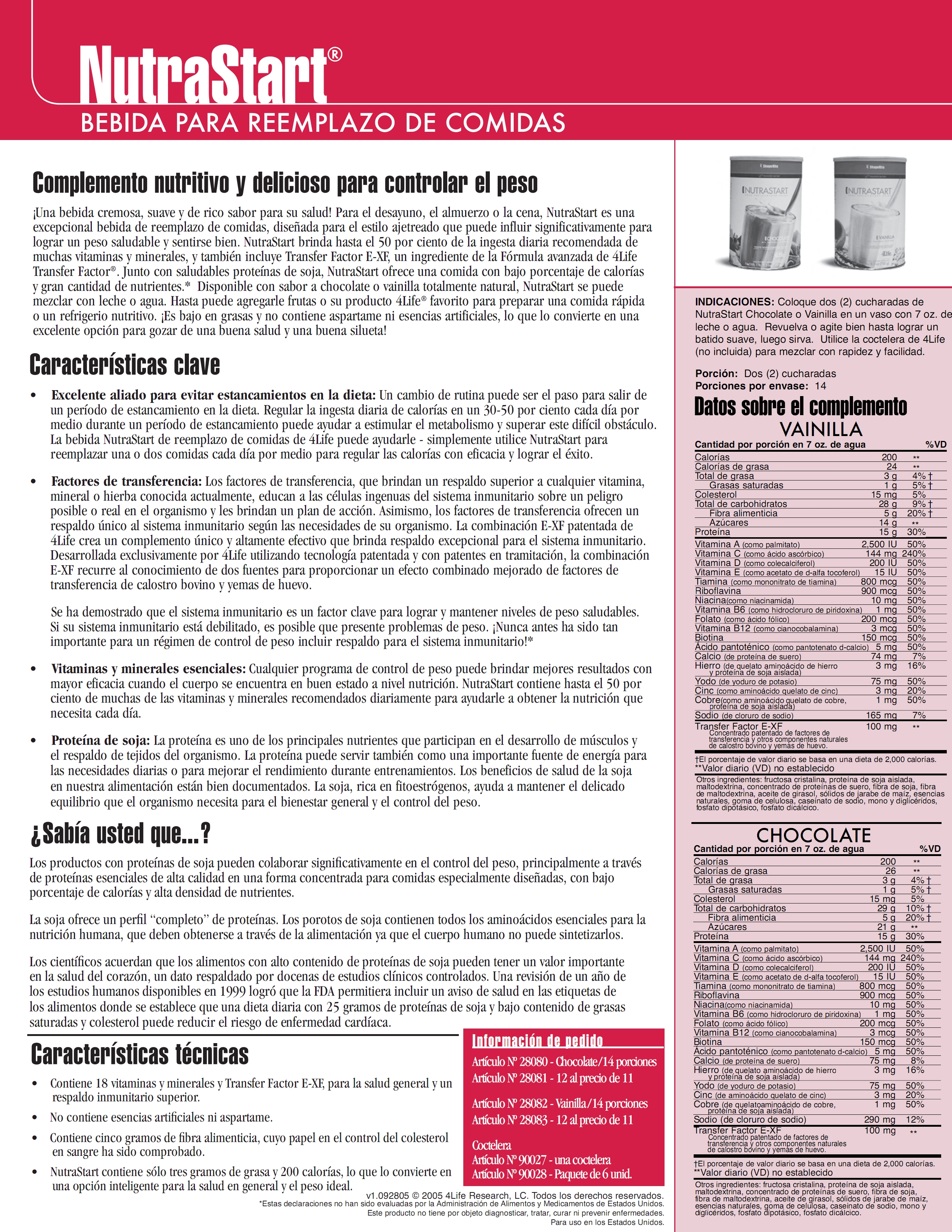 ¡Una bebida cremosa, suave y de rico sabor para su salud! Para el desayuno, el almuerzo o la cena, NutraStart es una excepcional bebida de reemplazo de comidas, diseñada para el estilo ajetreado que puede influir significativamente para lograr un peso saludable y sentirse bien. NutraStart brinda hasta el 50 por ciento de la ingesta diaria recomendada de muchas vitaminas y minerales, y también incluye Transfer Factor E-XF, un ingrediente de la Fórmula avanzada de 4Life Transfer Factor y gran cantidad de nutrientes.